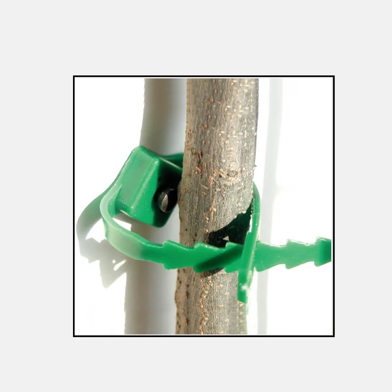 Attache plante verte en plastique rigide, mesurant 14 cm. Sa forme crantée permet un serrage ajustable et sécurisé autour des tiges sans les blesser. Idéale pour fixer les plantes à un tuteur ou à un support de manière rapide et propre.