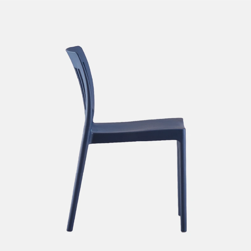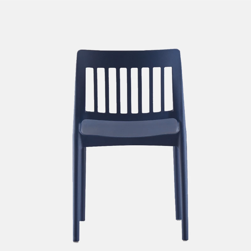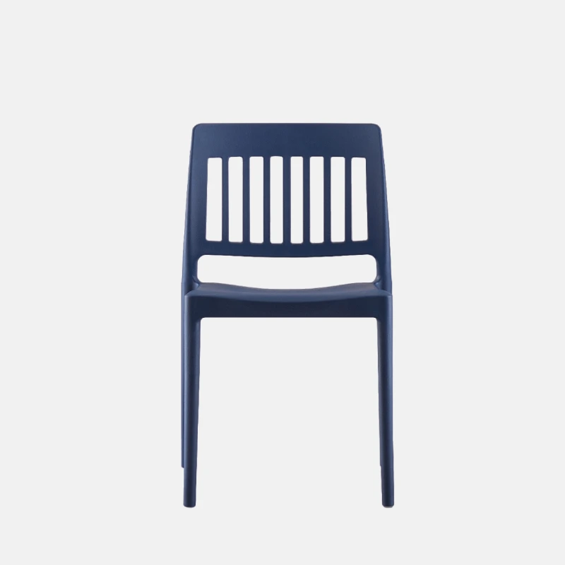 La chaise est constituée d’un cadre en plastique monobloc, sans joints visibles, ce qui lui confère une allure lisse et épurée. Les lignes sont simples et fonctionnelles, avec une assise plane et un dossier légèrement incliné pour un confort minimal mais efficace.