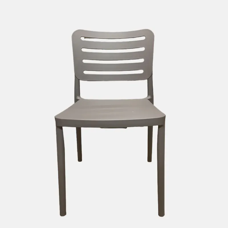 La chaise est constituée d’un cadre en plastique monobloc, sans joints visibles, ce qui lui confère une allure lisse et épurée. Les lignes sont simples et fonctionnelles, avec une assise plane et un dossier légèrement incliné pour un confort minimal mais efficace.