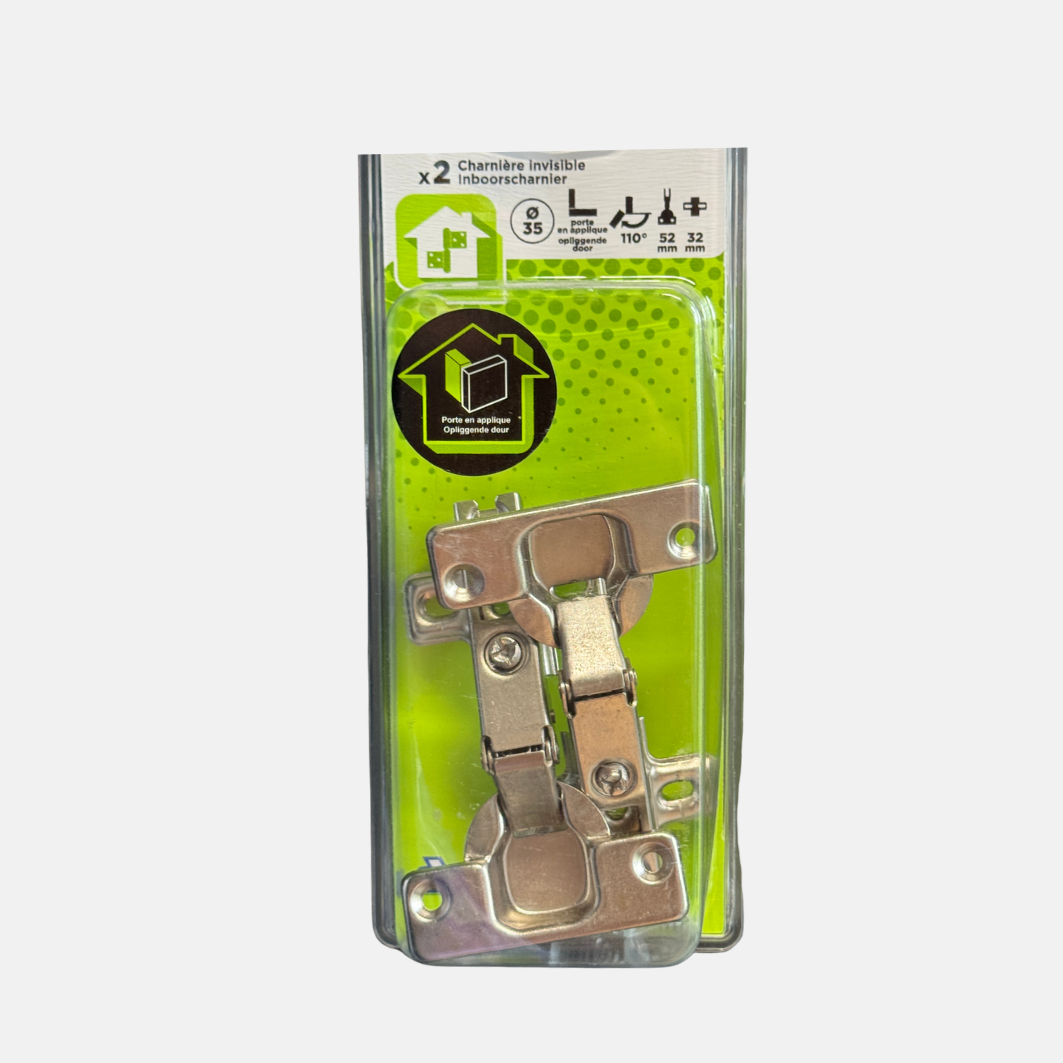 Charnière invisible à boîtier Ø35 mm conçue pour les portes de meuble en applique. Elle offre une ouverture large de 110° et un système à ressort permettant la fermeture automatique. Idéale pour meubles de cuisine ou de rangement.