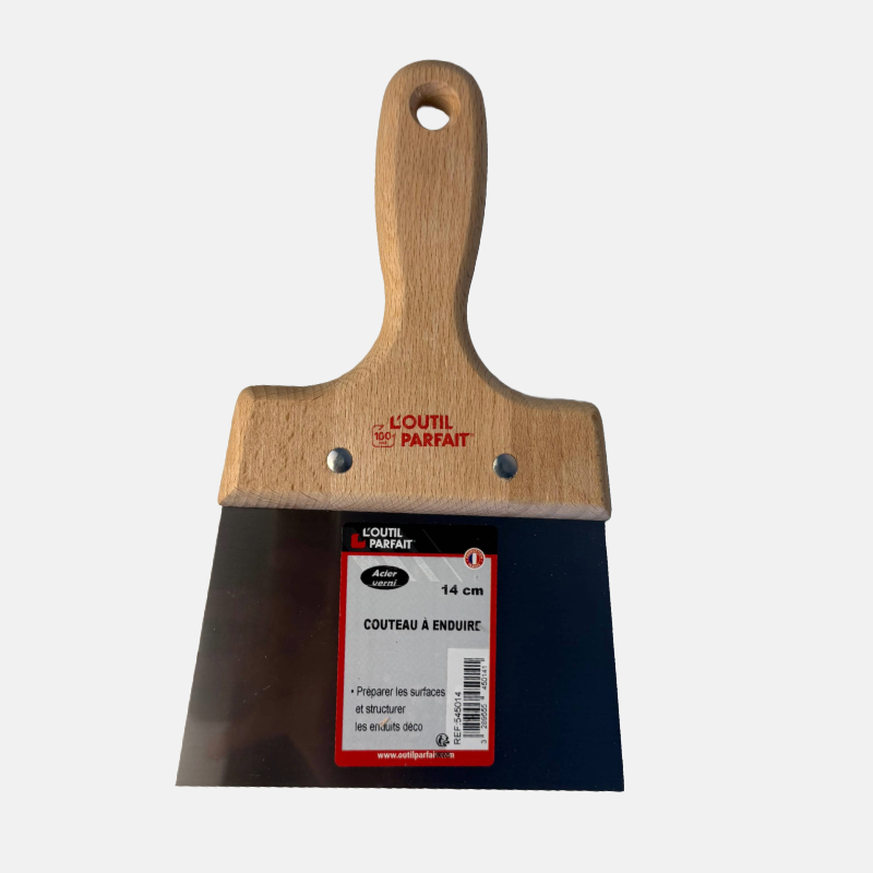 Le couteau à enduire 14 cm L’Outil Parfait est l’outil polyvalent par excellence pour les travaux de lissage, rebouchage ou pose d’enduits sur des surfaces de taille intermédiaire à grande. Sa lame souple en acier trempé permet une application fluide et homogène, avec une finition professionnelle. Son manche en bois ergonomique et solide, assure une prise en main confortable pour un usage prolongé, sans fatigue.