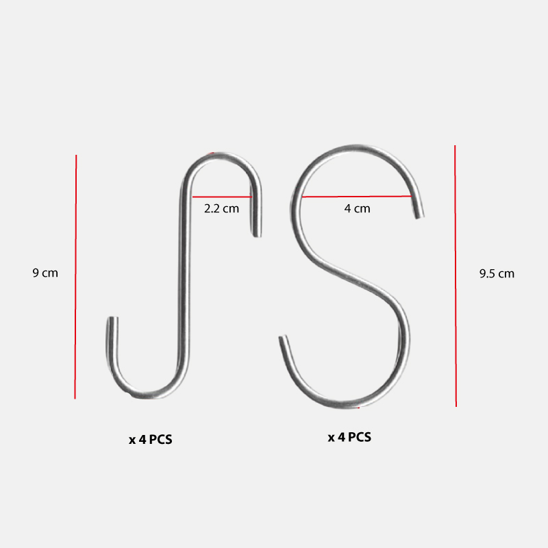 Fabriqués en acier inoxydable, le lot comprend 4 crochets en S (9,5 × 4 cm) et 4 crochets en J (9 × 2,2 cm), offrant ainsi deux formats complémentaires pour s’adapter à tous vos besoins de rangement à une utilisation aussi bien en intérieur qu’en extérieur.
