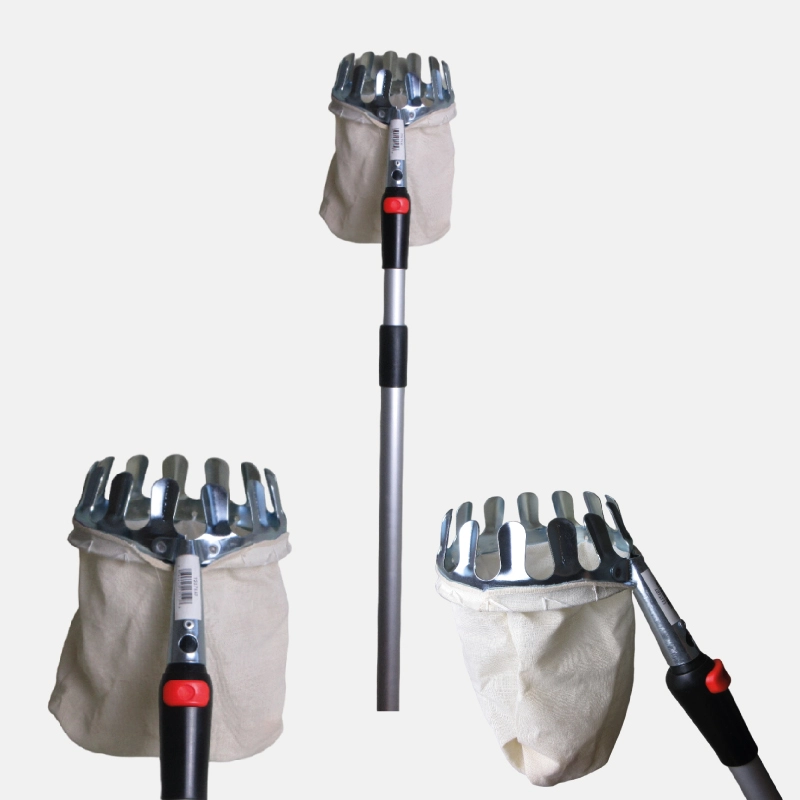 Le cueille-fruit est composé d’une tête en forme de panier et de griffes en acier inoxydable, conçue pour attraper délicatement les fruits sans les endommager lors de la récolte. Les griffes peuvent être ajustables pour s’adapter à différentes tailles de fruits.