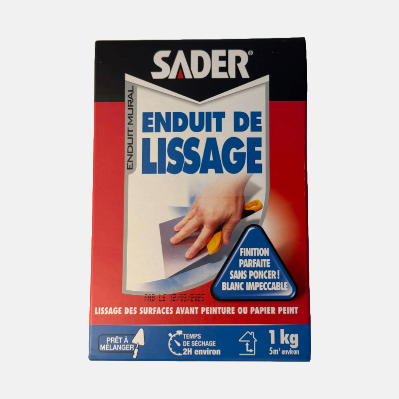 L’Enduit de Lissage SADER 1 kg est un enduit en pâte prêt à l’emploi, conçu pour préparer vos murs et plafonds avant peinture ou tapissage. Il permet d’obtenir une surface lisse et homogène, en masquant les petites imperfections, rayures, pores et irrégularités des supports. Facile à appliquer et à poncer, il offre une excellente adhérence sur les matériaux courants tels que le plâtre, le béton ou les anciennes peintures. Idéal pour des finitions nettes et professionnelles en intérieur.