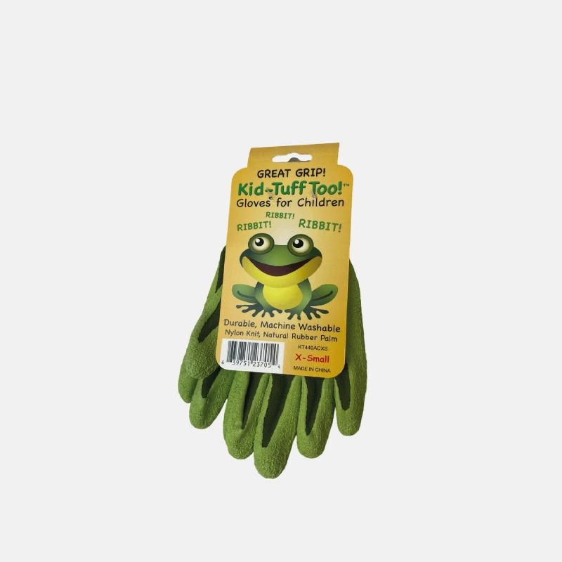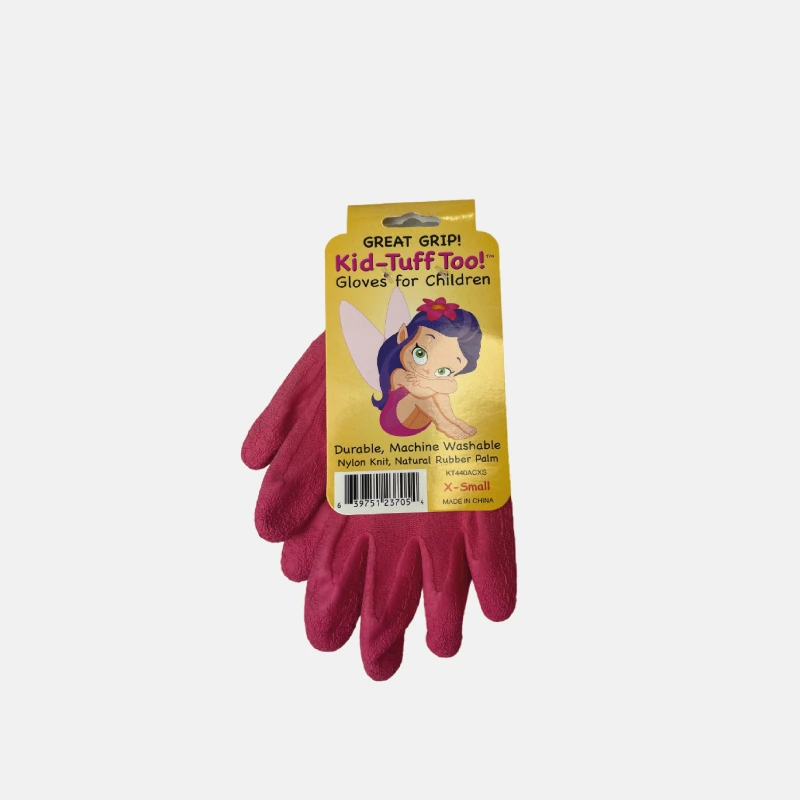 Paire de gants de jardinage pour enfants, spécialement conçus pour offrir une bonne prise en main et une protection adéquate. La taille indiquée est XS (extra-small), adaptée aux petites mains des enfants. Les gants sont de couleur avec des paumes en caoutchouc naturel pour une adhérence optimale. Ils sont fabriqués en nylon tricoté, offrant une durabilité et un confort supplémentaire.