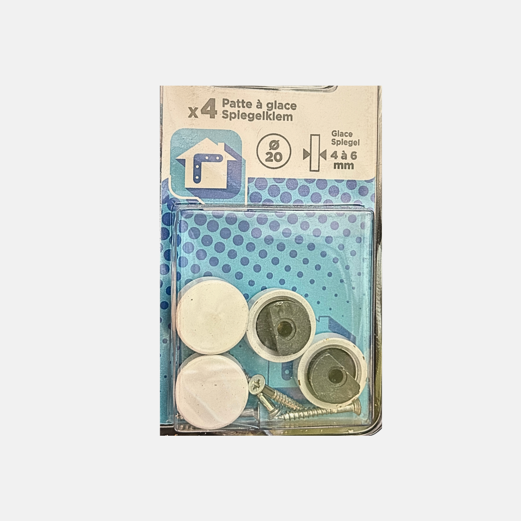Patte de fixation pour miroirs et plaques de verre. Son revêtement époxy blanc protège la surface du verre tout en assurant une fixation fiable et discrète.
