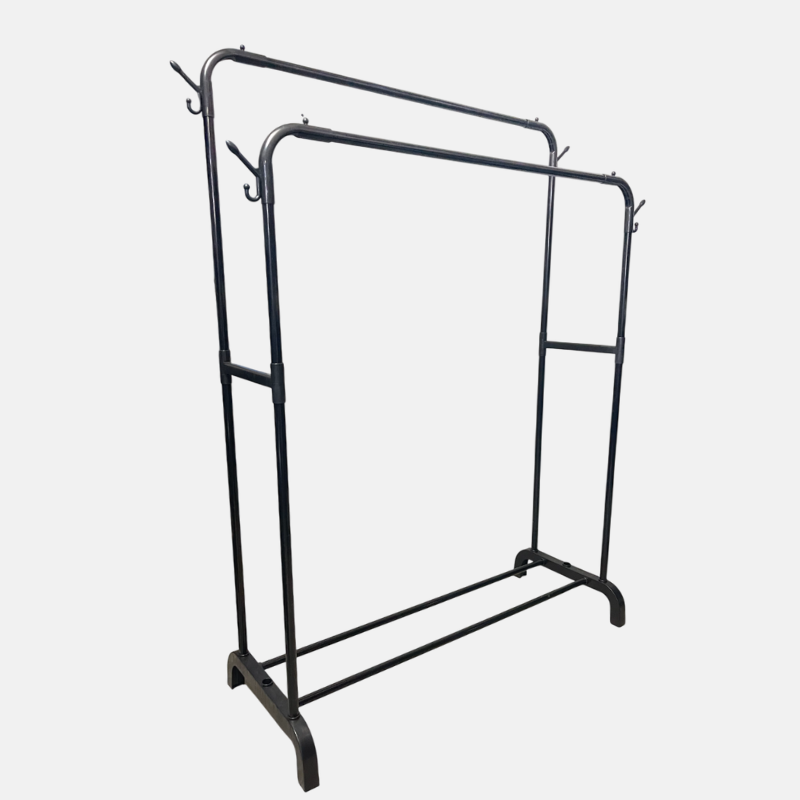 Penderie noire à double niveau de suspension, idéale pour maximiser le rangement de vos vêtements. Conçue en polymère, elle allie solidité et légèreté. Elle dispose de deux barres parallèles en hauteur permettant de suspendre un grand nombre de vêtements sur cintres, parfait pour séparer chemises, vestes ou pantalons.