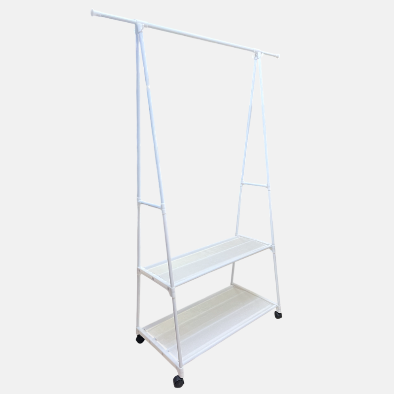 Penderie blanche sur roulettes, pratique et design, idéale pour organiser vos vêtements au quotidien. Fabriquée en polymère, elle est à la fois légère et résistante. Elle comprend une barre de suspension pour cintres ainsi que deux étagères inférieures parfaites pour ranger chaussures, sacs ou boîtes. Facile à déplacer grâce à ses roulettes, elle s’adapte à tous les espaces : chambre, dressing ou buanderie.