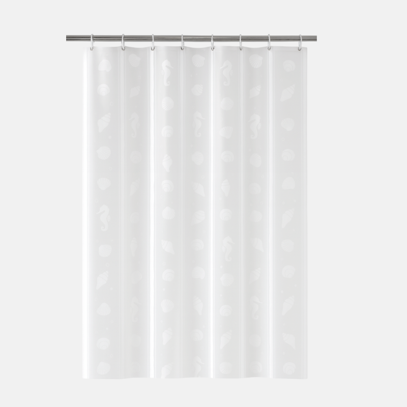 Ce rideau de douche en polyéthylène de 180 × 180 cm présente un motif discret de coquillages, hippocampes et bulles sur fond translucide. Son design marin apporte une touche élégante et apaisante à la salle de bain