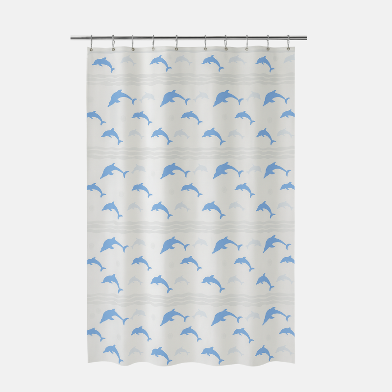 Ce rideau de douche en polyéthylène de 180 × 180 cm présente un motif discret de dauphins sur un fond translucide. Son design marin apporte une touche élégante et apaisante à la salle de bain