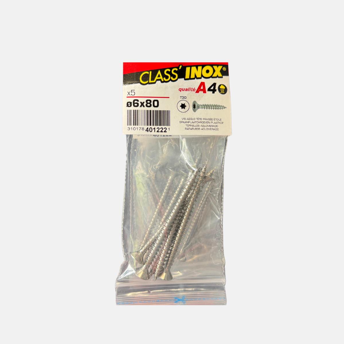 Vis aggloméré inox A4 Ø6 x 80 mm conçue pour la fixation du bois et des panneaux. La tête fraisée permet un montage affleurant et soigné, tandis que l’empreinte étoile assure un vissage rapide et précis.